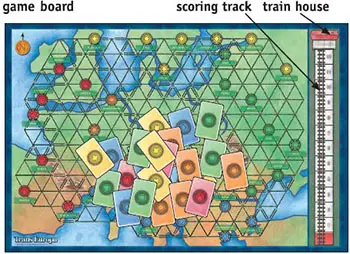 In each player's first turn, he places his starting marker on any empty crossing point on the game board. A city is also considered to be on a crossing point and players may place their starting markers on cities as well. A player's starting marker is the starting point for that player's track network.