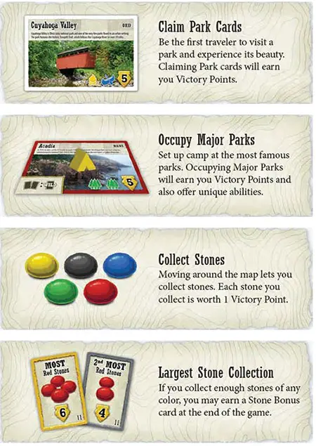 If there is a tie, the player who has scored the most points from Park cards and Major Parks is the winner. If this also creates a tie, the player who has collected the most stones wins. In the rare event that players are tied in both ways, they all share the victory!