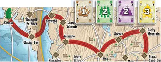 The green Trekker in the previous example is a distance of 2 away from Lassen Volcanic. To make this trip he can use one '2' Trek card, or combine two '1' Trek cards.