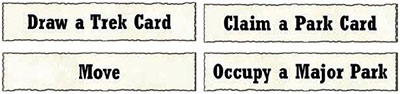Examples: You may choose to move and then draw a Trek card. Or, move and then move again. Or, draw 2 Trek cards. Or, move and then claim a Park card.