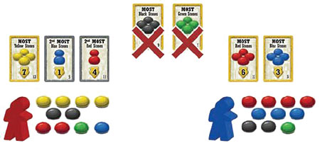 Award the MOST Stones Bonus cards: The player who has collected more of a stone color than any other player is awarded the Most Stones Bonus card for that color.
