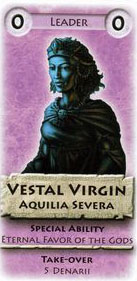 If Aquilia Severa is played during a faction take-over, the new controlling player receives the eternal favor of the gods tile, provided he does not yet possess it. The eternal favor of the gods need not be returned when the controlling player loses control over the Vestal Virgins (as opposed to the temporary favor of the gods tile, which must be).