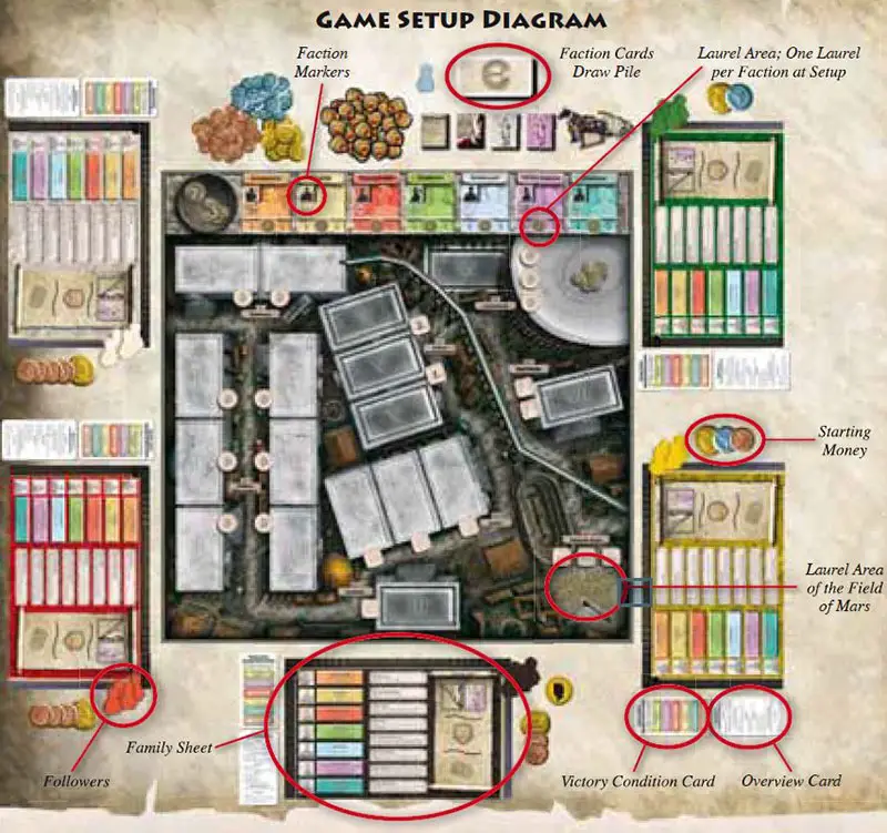 - Place the legion tokens, denarii, scroll/tribune tiles, eternal favor of the gods tiles, temporary favor of the gods tile, chariot, and proconsul piece next to the game board. These are collectively the "stock".