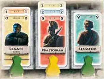 Next, the player whose follower occupies the "3" follower space examines the remaining cards and may, at his option, purchase any one of them for 3 denarii, which are also placed on the Colosseum. Finally, the player whose follower occupies the "2" follower space examines the remaining cards and may, at his option, purchase any one of them for 2 denarii, which are placed on the Colosseum. Any remaining cards are discarded.