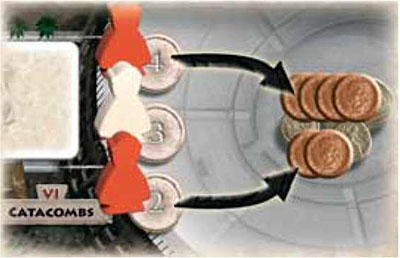Note that players who do not wish to purchase any of the available cards don't have to pay, and remember that denarii paid for cards taken from the Catacombs are always placed on the Colosseum area, rather than in the stock of denarii to the side of the game board. Note also that unoccupied follower spaces are simply passed over when evaluating the Catacombs.