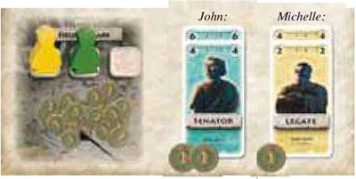 John reveals a value 6 Senator and a value 4 Senator. Michelle turns up a value 4 Legate and a value 2 Legate. Since each of them discarded a legal pair of cards, each takes one laurel. John also takes an additional laurel, since his pair's sum of values is 10, compared to Michelle's sum of only 6.