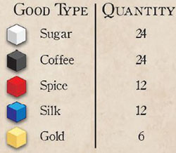 Finally, tally 1 gold for every 3 sugar, 3 coffee, 2 silk, 2 spice or 1 gold good remaining in your cargo hold. The player with the most gold is the winner!