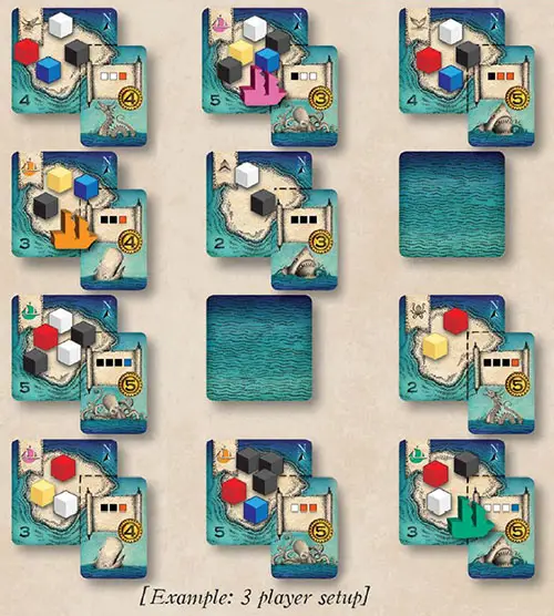 Shuffle the island cards and randomly form a 3 card wide x 4 card tall play area, or "map", in the center of the table with all of the islands face up. Make sure that all islands are oriented so that north is facing the same direction.