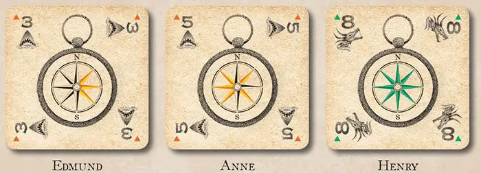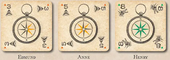 The compass on the navigation card shows the directions that yon may sail...and the directions that are unavailable due to the tricky tides! Available headings are highlighted in the suit's color; unavailable headings are not highlighted.