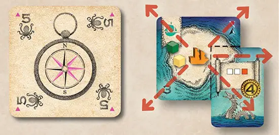 Beginning with the leader, set sail by moving your ship one space to an adjacent island card in a direction listed on your card's compass.