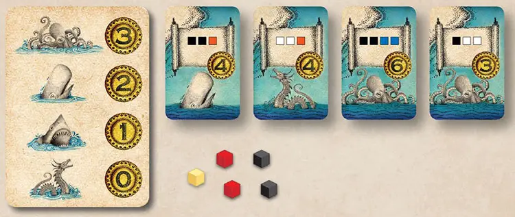 Set any extra ship pawns, ship boards, or anchor tokens aside. Place all of the goods cubes into the draw bag. Shuffle the monster sightings bonus cards and deal one to each player, coin side down. You may look at your card, but keep it hidden from other players.