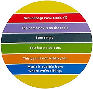 Players receive cards on which 6 statements appear. The only acceptable responses to the statements you hear are "TRUE" or "FALSE".