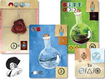 First, locate the following Laboratory boards: Claude Duval, Isaac Newton, Heinrich Cornelius Agrippa, and Roger Bacon. Alchemist components can be identified by depictions of their faces, as seen in points 1-4 below.
