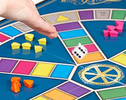 At the start of the game, move away from the center, along any of the spokes. When you reach the circular track, you can move in any direction. Plan your moves carefully so that you land on the space that suits you best.