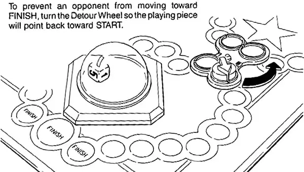 Turn any ONE of the four Detour Wheels in any direction. This is an important option because you can improve your chances of reaching FINISH or keep an opponent from reaching FINISH. See example below: