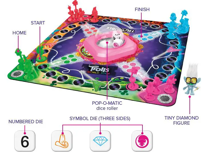 Place Tiny Diamond on the special space in your corner of the board, and move one of your Trolls already on the track the number of spaces shown on the numbered die.