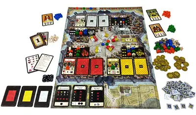 Troyes is a strategy game in which you represent a rich family from the Champagne region of France, using your infl uence to recruit and supervise individuals from the three prominent domains: military (associated with the color red in every aspect of the game), religious (white), and civil (yellow).