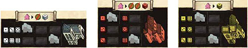 A red die grants access to the Palace; a white die, the Bishopric; and a yellow die, City Hall. The value of the die shows the location inside the building where the citizen is placed. Find the small picture of a die showing the same value that you rolled.