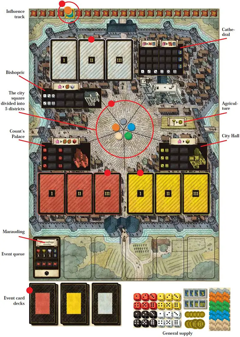 Each player places the citizens from his personal supply on the 3 principal buildings on the game board (Palace, Bishopric, and City Hall). To place a citizen, simply put it on an empty space in one of the 3 buildings. Once a citizen is placed, it is not moved again during the initial placement.