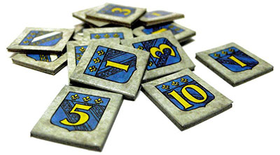 Note: During the game, VPs are hidden. In order to maximize suspense during the fi nal tally, for each type of scoring, each player should make piles of 10 VP in front of himself. This also makes it very easy to compare the players' scores.