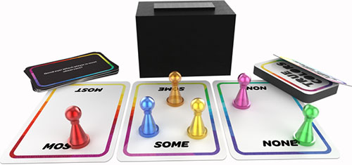 Players now turn in all their voting cards (make sure that you don't let the others see which of your cards are missing since this would give away your vote). Each player then receives a full set of voting cards. The next player takes a question card, turns it over, and reads the question aloud.