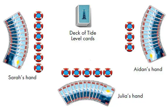 Separate the cards into two decks according to card back. Shuffle the 24 Tide Level cards (blue back) and stack them face down in the middle of the playing area.