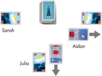 Take the 12 Weather cards that made up your hand, along with the corresponding life preserver tokens, and pass them all to the player on your left. (Turn all of the life preservers face up).