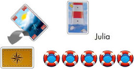 Julia has 5 total life preservers shown on her 12 Weather cards and receives 5 life preserver tokens.