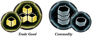 Players may also accumulate commodities. A commodity represents a product that is plentiful within a player's empire. Commodities have no inherent value but become trade goods when given to another player. Both trade goods and commodities are represented by opposite sides of the same token, and exist in values of "1" or "3".