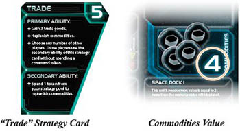 When a player gives another player a commodity, that commodity converts into a trade good; the player receiving the commodity flips the token to its trade good side. Players are encouraged to replenish commodities through the "Trade" strategy card and trade them to one another in mutually beneficial transactions.