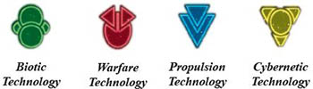 There are four basic colors of technology. A technology's color is indicated by a green, red, blue, or yellow symbol located on the lower-right corner of the card. Players use these symbols when researching technology.