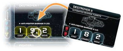 These abilities are always followed by a number that determines the minimum die result required to produce a hit. For example, "Bombardment 5" indicates that the player rolls a single die, and if the result is five or greater, it produces one hit.