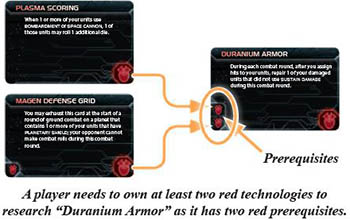 After the player researches the "Duranium Armor" technology, it satisfies another red prerequisite, as indicated on the lower-right corner of the card; the next time that player researches a technology, he may research a technology that has three red symbols as a prerequisite. Unit upgrade technologies, unlike other technologies, may have prerequisites composed of multiple colors. Additionally, unit upgrade technologies do not satisfy prerequisites when researching technology.