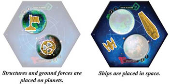 When a unit is placed in a system, it is placed in one of two areas on the tile. Structures and ground forces are usually placed on planets, while ships are placed in space-the star-filled area surrounding the planets.