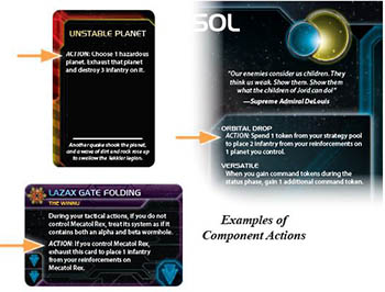 A component action is an action that is printed on a game component. Many action cards, faction sheets, and even some technology cards have component actions. Each of these effects is preceded by the word "Action".