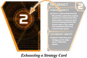 After each player has had an opportunity to resolve a strategy card's secondary ability, the active player exhausts that strategy card by flipping it facedown. Players cannot resolve abilities on exhausted strategy cards, but the exhausted cards' numbers are still used to determine initiative order.