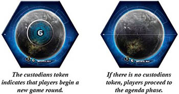 Return strategy cards: Each player returns his strategy card to the common play area. Then, if the custodians token is no longer on Mecatol Rex (the planet in the center of the game board) the game round continues to the agenda phase. Otherwise, a new game round begins with the strategy phase.