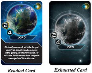 Many cards have a readied and an exhausted state. An exhausted card is flipped facedown, indicating that the values and abilities on the front of the card cannot be used.