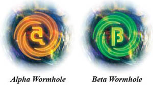 Some system tiles contain wormholes. There are two types of basic wormholes-alpha and beta-as indicated by the wormhole's symbol. Systems that contain identical wormholes are adjacent to one another for all purposes.