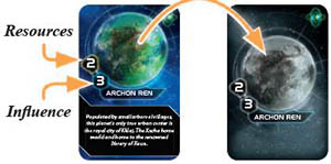 To spend a planet's resources or influence, a player exhausts that planet's planet card. For example, if a player needs to spend two resources to produce units, he can exhaust a planet that has a resource value of "2" or instead exhaust two planets that each have resource values of "1". The player could exhaust a planet that has more resources, but the excess resources are lost.