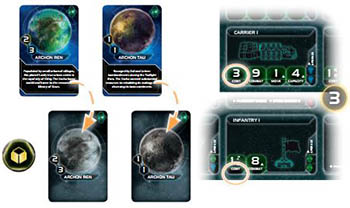 He intends to produce one carrier and as many infantry as he can afford. His space dock has a production value of "3", meaning that it can produce up to three units. The cost of a carrier is three resources, and the cost of two infantry is one resource [3], so he will need to exhaust at least four resources total to produce them.