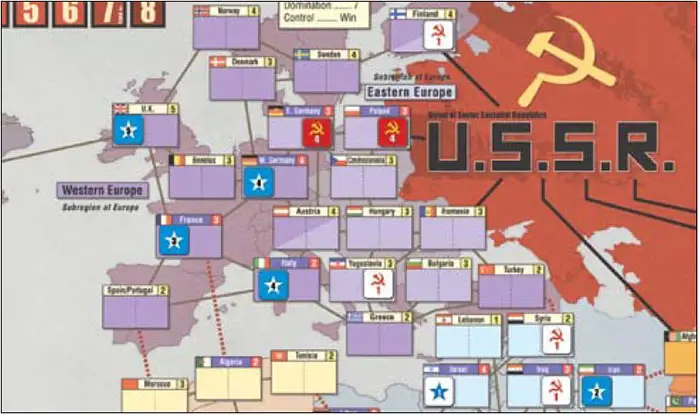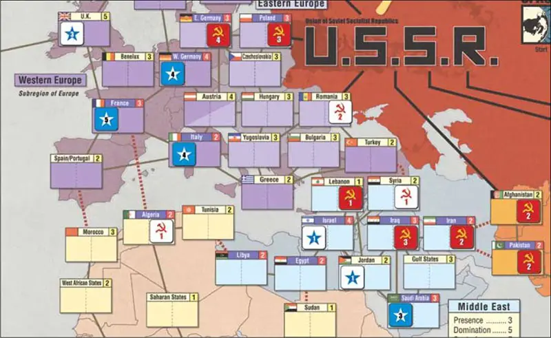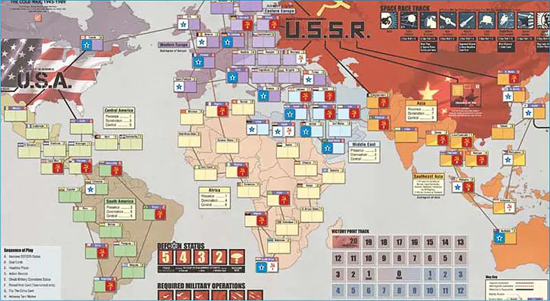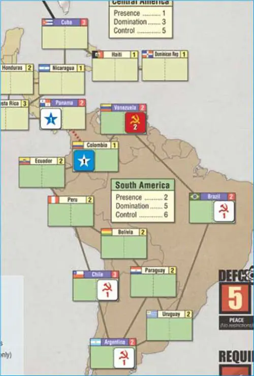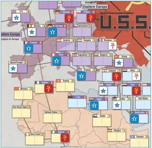 The Soviet Player keeps his eyes firmly on a Midwar prize. Sensing blood in the water after turn 1, he tries to expand his foothold in Latin America into a power base. That would spell doom for the Americans in the Midwar. The cries of Yanqui go home get louder and louder down south. Additionally, by couping immediately and bringing DEFCON down to two, he prevents the US from targeting a battleground country for a coup.