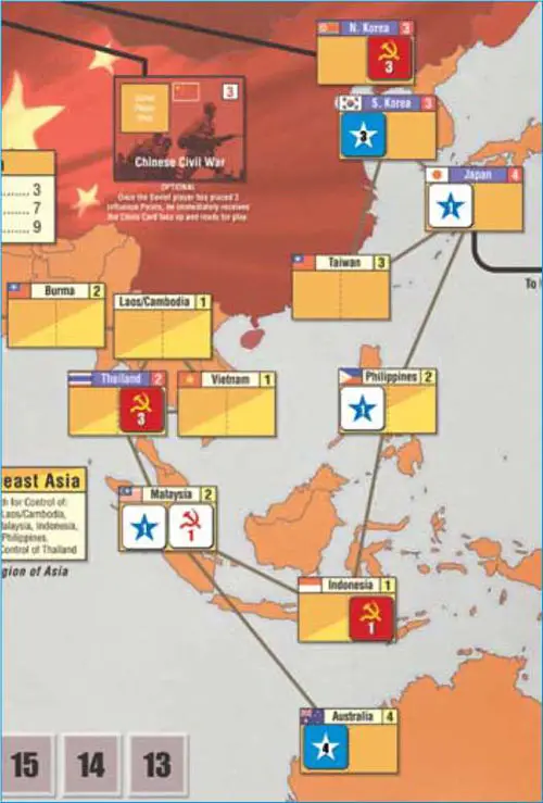 To help players follow along, the number of Influence Points in a country after the action is performed is indicated in parenthesis. The number before the slash is US influence and the number after the slash is USSR influence (US/USSR). If the number is bold and with a "C", it indicates control.