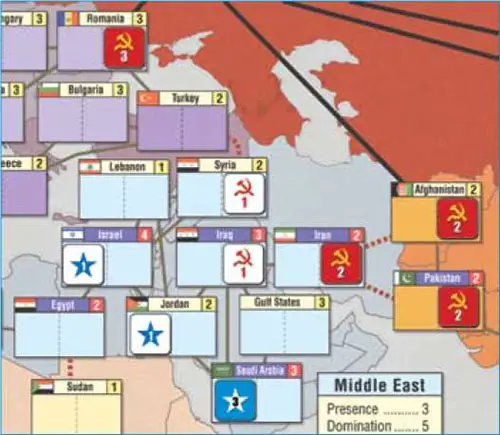 Similarly, but without the hindrance of Red Scare, Chris uses this card to actually strengthen his hand in the Middle East. He has not really contested Stefan's Domination of Europe. But he is keenly interested in all that oil! The US knock an Influence point out of Romania (0/2), Poland (0/3C) and East Germany (0/3C). Only the East German point is restored.