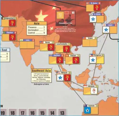 Fearing the US player has the Asian scoring card, Chris reacts to Stefan's Korean gambit by attacking Asia's soft underbelly Pakistan. Furthermore, with Europe Scoring already played, President De Gaulle seems less appealing as an event play.