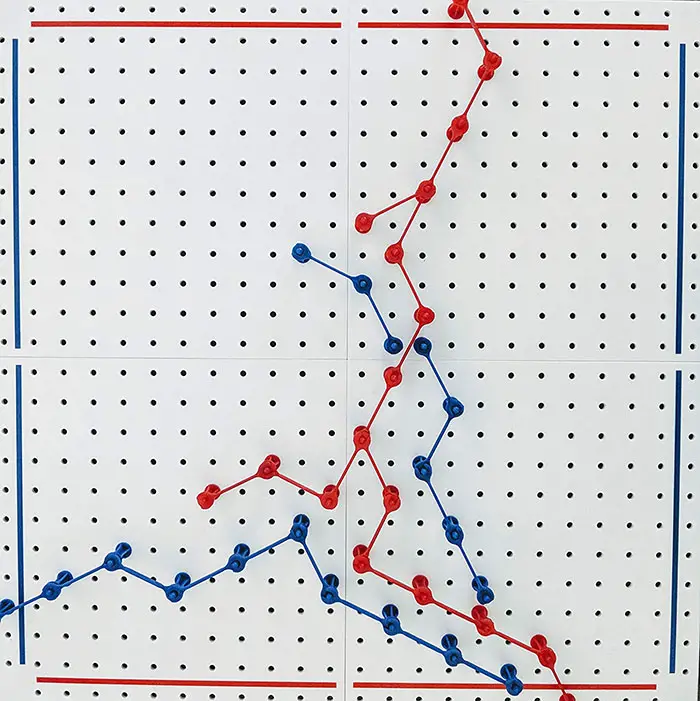 Pegs may be linked only when the distance between them corresponds to the diagonal of a 6-holed rectangle (see TERMS, "Twix" and "Double-Link").