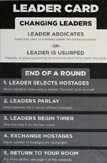 The game consists of 3 timed rounds. Each round is shorter than the previous round. At the end of each round, the hostages selected by the leaders will be traded into opposing rooms.