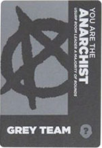At some point during the game, before time expires in the final round, you must exchange your card for a Red Team card or a Blue Team card (done with the extra unused team cards). You now assume the allegiance of the team you chose. If you forget to exchange your card by the end of the game or if they are unable to, then they fail to win their objective