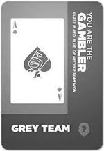 At the end of the last round (the 1 minute round), before all players reveal their cards, you, the Gambler, must publicly announce which team (Red Team, Blue Team, or neither) you think won the game. If you are correct, you win. If you are incorrect, you lose.