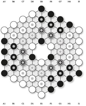 When all pieces are on the board, all spaces will be occupied and the game starts according the rules described above.